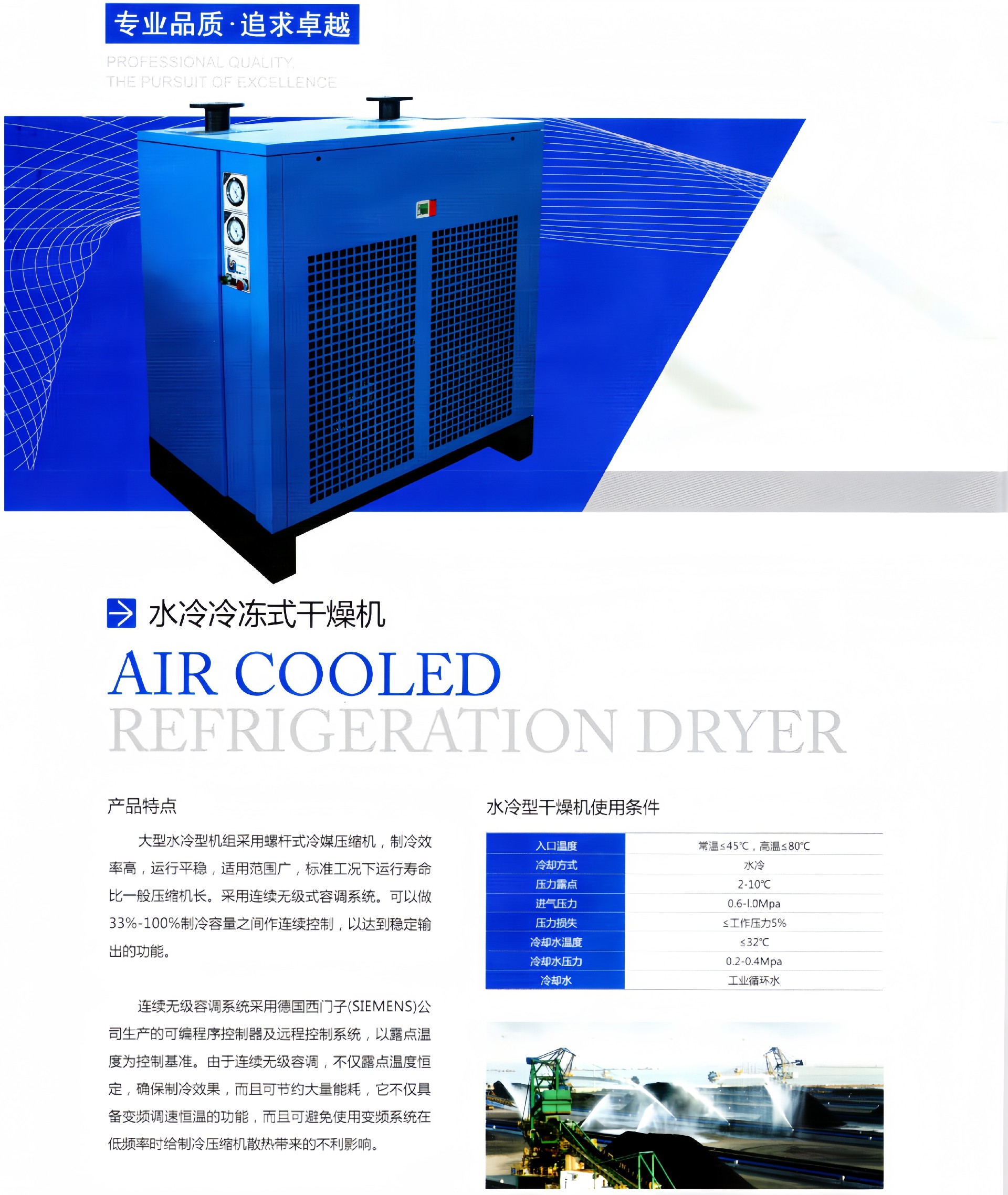 产品描述:工况条件与技术指标进气温度(Inlettemperature):≤80℃冷却方式(Coolingmethod):水冷(Water-cooling)进气压力(Inletpressure):0.6~1.0Mpa压力损失(Pressuredrop):≤0.03Mpa压力露点(Dewpoint):2~10···